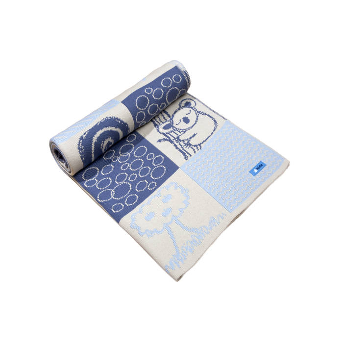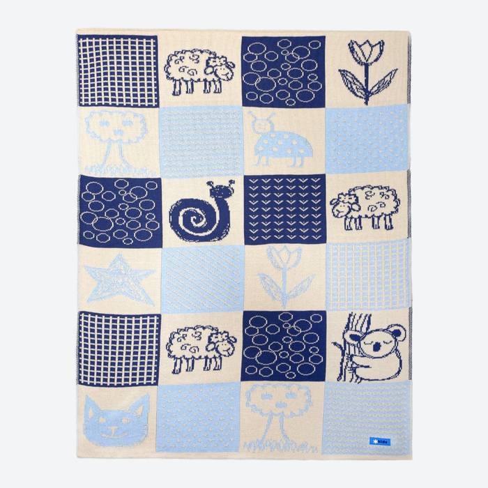 Merinowol babydeken gebroken wit/blauw met dieren 70 x 90cm Q103