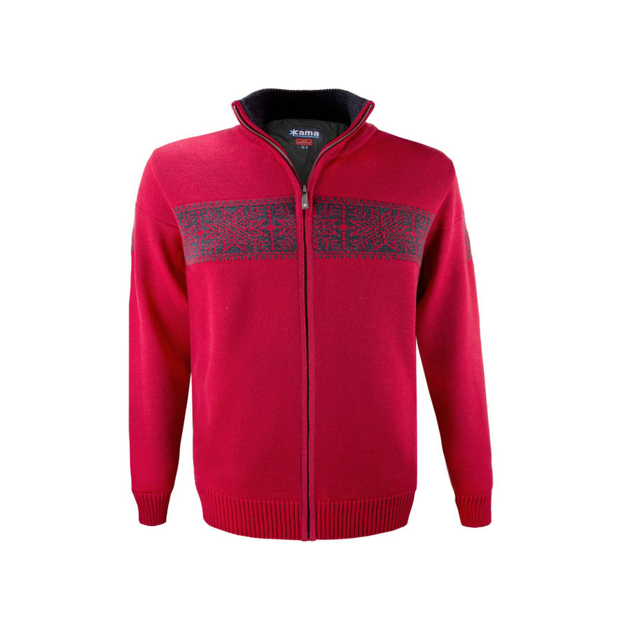 100% Merinowol rood vest van Kama Fashion & Function met winddichte windstopper voering. Met prachtig Noors retromotief. Van topkwaliteit merinowol garen.