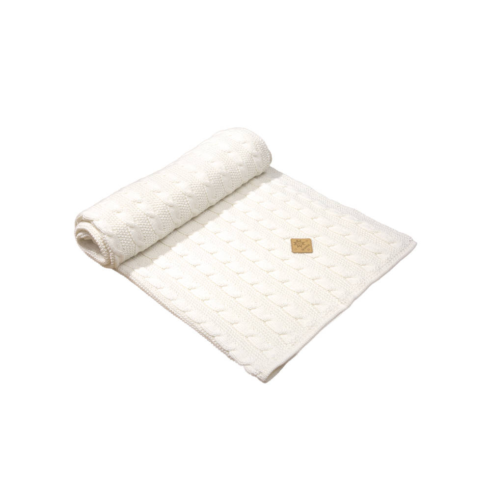 Fijngebreide wiegdeken van heerlijk zachte topkwaliteit merino wol van Schoeller. De deken heeft een prachtig patroon en warme kleuren en staat daardoor prachtig in de wieg of kinderwagen.