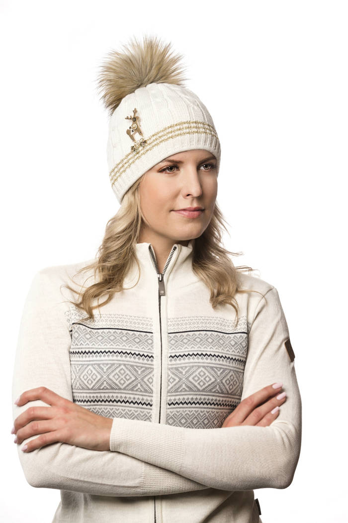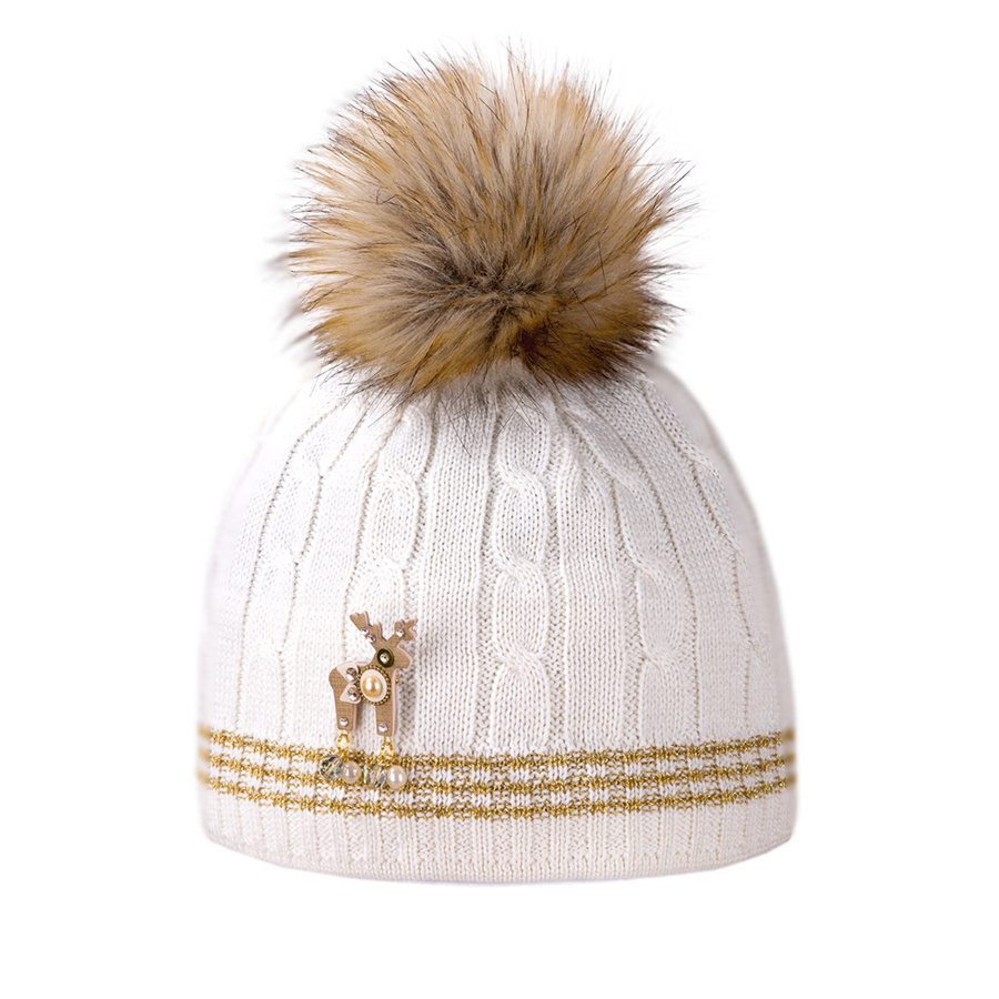 Schitterende witte fashionable en luxe muts, versierd met een prachtig Deers sieraad met Swarovski kristallen, gouddraad en pompoen. Gevoerd met zachte fleeceband waardoor deze muts heerlijk draagt.