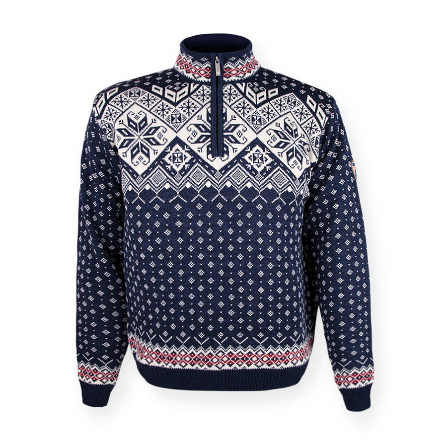 Fijn gebreide blauwe trui van Kama Fashion & Function met prachtige Noorse retromotieven. Gemaakt van 100% topkwaliteit merinowol.