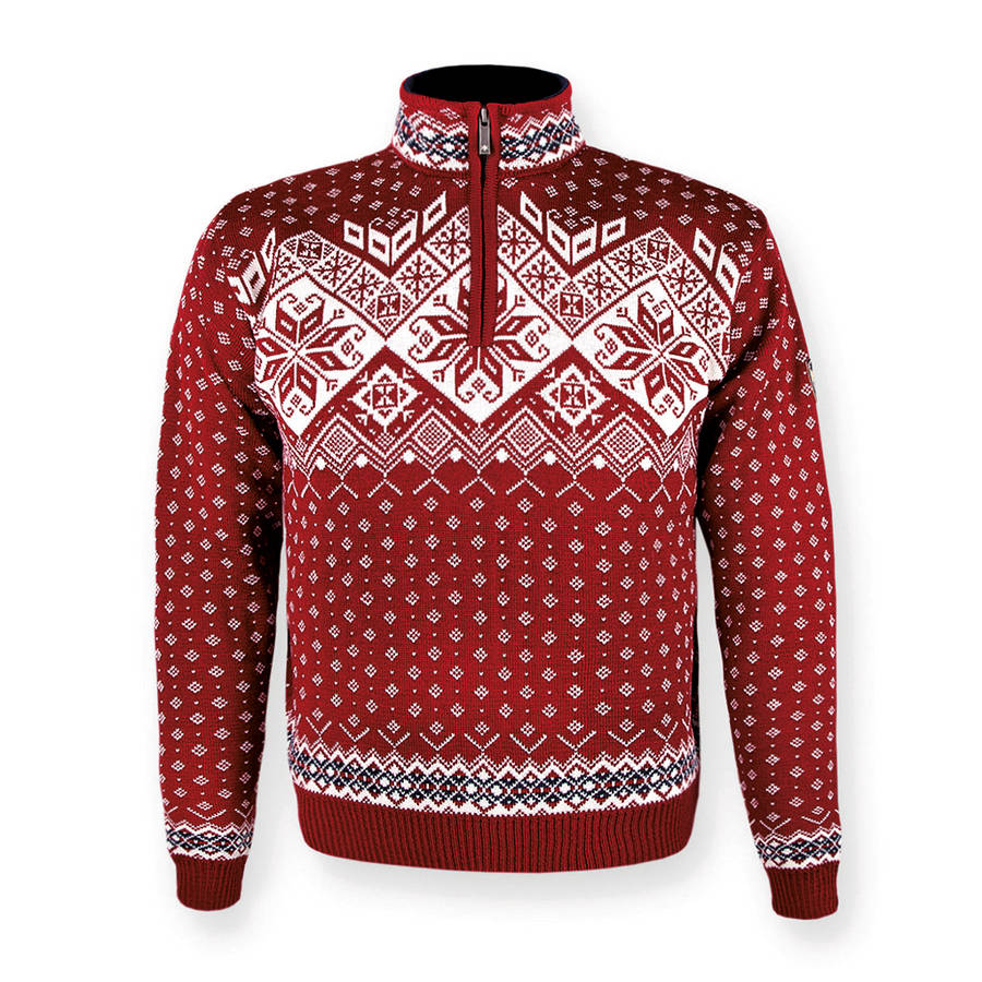 Fijn gebreide rode trui van Kama Fashion & Function met prachtige Noorse retromotieven. Gemaakt van 100% topkwaliteit merinowol.