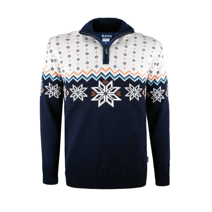 Fijn gebreide witte - navy trui met windstopper voering van Kama Fashion & Function met prachtige Noorse retromotieven. Van topkwaliteit merinowol garen, met teflon behandeling waardoor het water en vuilafstotend is.