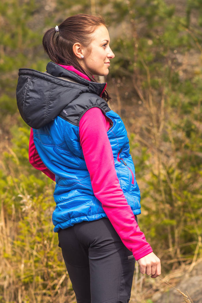 Isolerende sportief vest voor Outdoor, Buitensport en tijdens de wintersport. Licht van gewicht en van heerlijk zacht materiaal. De capuchon en schouders zijn gemaakt van waterafstotend materiaal en daardoor bestand tegen natte sneeuw en lichte regen.